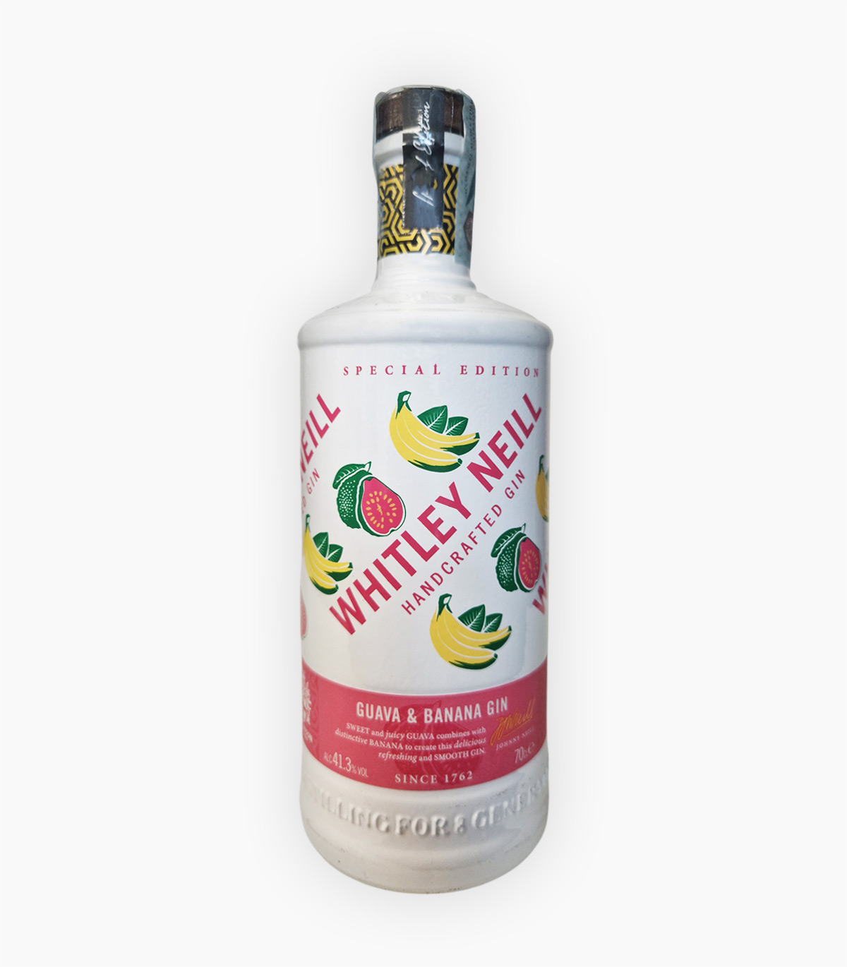Whitley Neill Banana & Guava è un gin fruttato ed esotico. Viene ottenuto attraverso l’infusione in alcol di frutti esotici come banana e guava (oltre che ad altre botaniche come ginepro, semi di coriandolo, corteccia di cassia, radice di angelica, radice di liquirizia, scorza di arancia, scorza di limone) che creano un gin ricco di sapore.